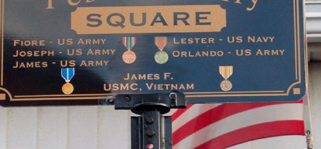 The sign in the square, which previously bore the name of my father and four of his brothers, is covered in black cloth. My aunt Phyllis, Jimmy's 95-year old mother, is given the honor of pulling the cloth off the sign to reveal the name of her son, who now joins his uncles in a permanent place of honor in his hometown.
